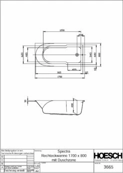 Hoesch Baignoire Spectra 3665.010 Blanche, 170x80cm, Avec Zone De Douche