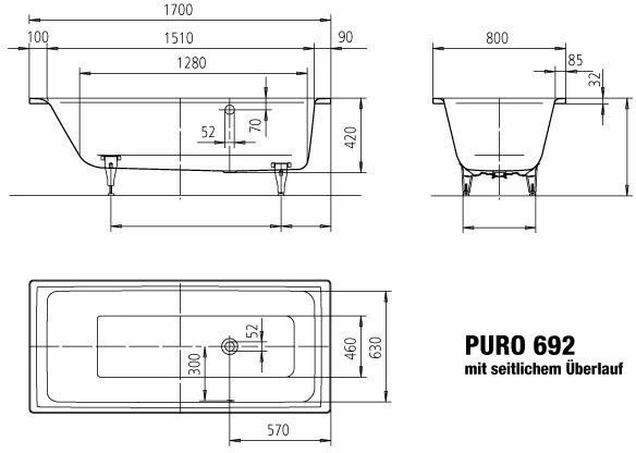 Kaldewei Puro Baignoire 258830000701 170x70cm, Trop-plein Latéral, Antidérapant, Noir
