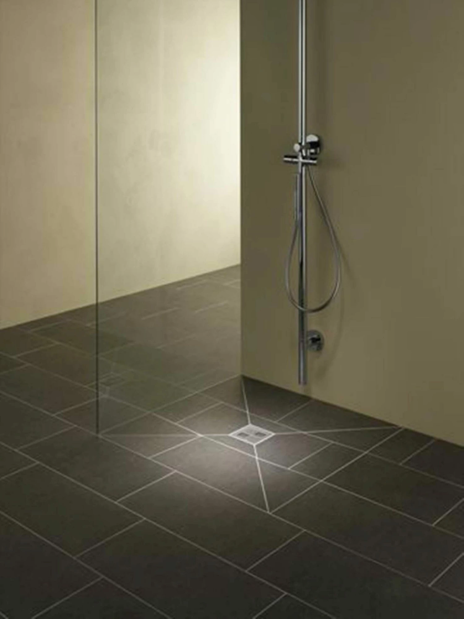 - Elément de douche en mousse étanche à l’eau, semi-rigide revêtu, avec un gradient intégré d’environ 2,5%, centrée ou décentrée plaque d’écoulement intégré et étanchéifié avec le drain horizontal. cadre de grille d’écoulement rotatif